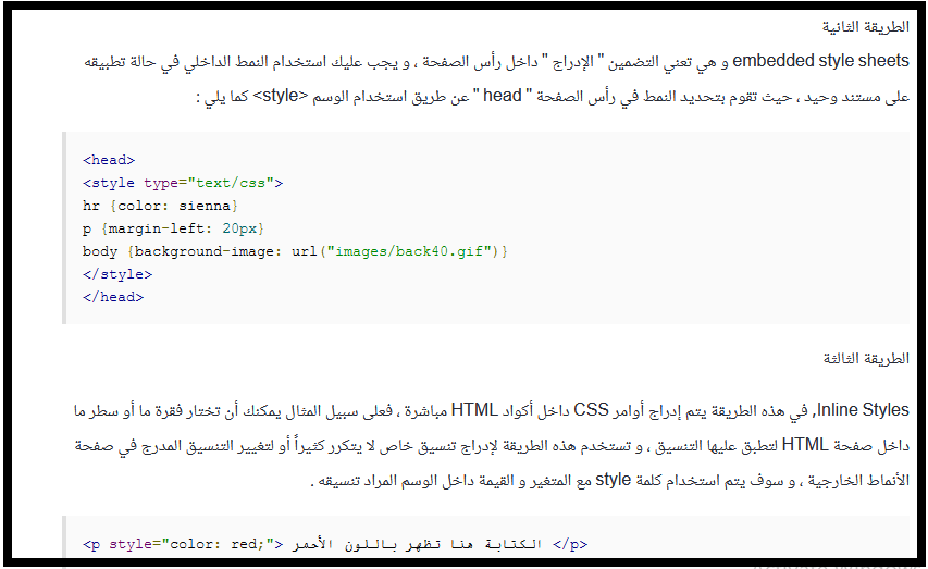 head و يجب أن يتم إدراج هذا الأمر في منطقة رأس الصفحة link عن طريق الأمر html في ملف نصي يتم استدعاءه من خلال جميع صفحات الـ css في هذه الطريقة يتم إدراج جميع أوامر