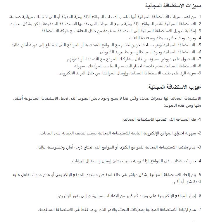 الصورة التالية بها مميزات وعيوب الاستضافة المجانية